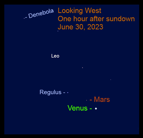 Pull out your binoculars and make sure you have a clear western horizon after sunset the next few nights. You’ll need them to see an amazing close encounter between the planet Mercury and the star Regulus, the heart of the lion. This evening, they’ll pass just one-tenth of a degree from each other — less than the width of a pencil held at arm’s length.