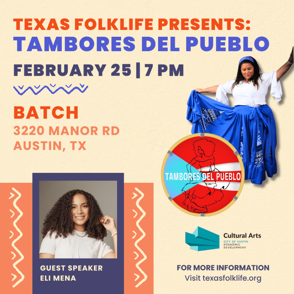 Don’t miss this incredible opportunity to celebrate Puerto Rican Bomba and connect with its rich cultural legacy. Whether you are a seasoned enthusiast or new to Bomba, this event promises an unforgettable evening filled with music, dance, and cultural exploration. Join us for a night that honors the soul and spirit of Puerto Rican Bomba and experience the magic of this powerful musical tradition. And remember, by supporting Texas Folklife, you are contributing to the preservation of Texas’s unique and diverse cultural heritage.