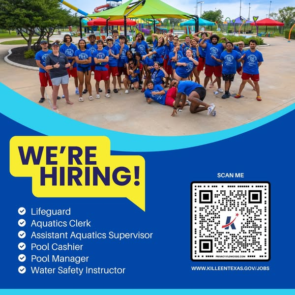Killeen Parks & Rec is hiring lifeguards, pool managers, water safety instructors, and more. Apply now killeentexas.gov/jobs! They offer good pay & flexible hours. The city covers all certification costs and these are all excellent leadership & training opportunities Onboarding starts in April and their Aquatics program was just recognized as one of the Top 100 swim lesson providers in the U.S. by the American Red Cross! Be part of a team that makes a difference.
