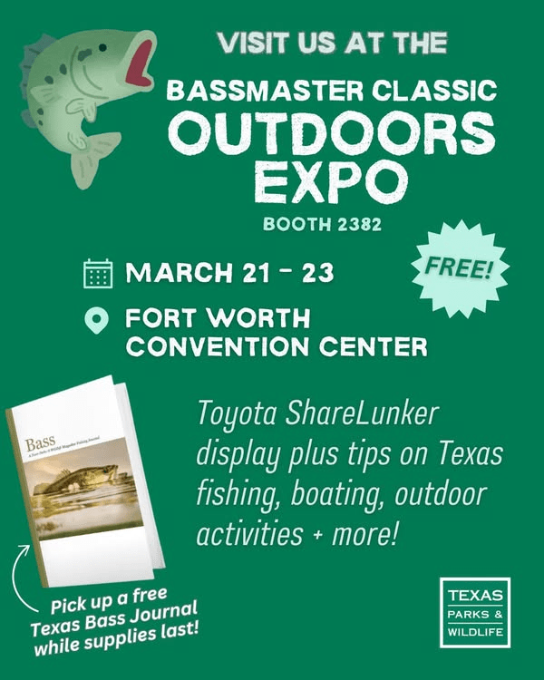 The Toyota ShareLunker program, which runs from January 1 through March 31, allows anglers who catch a 13-plus pound bass to loan it to the Texas Parks and Wildlife Department (TPWD) for selective breeding and stocking. Anglers can report their catch 24/7 through the ShareLunker hotline.