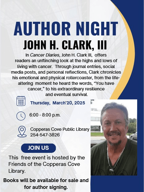 The Friends of the Copperas Cove Library are hosting a special Author Night this evening, featuring local author John H. Clark III and his book, Cancer Diaries. This free event will take place from 6:00 PM to 8:00 PM at the Library Meeting Room, located at 501 S. Main Street, Copperas Cove.