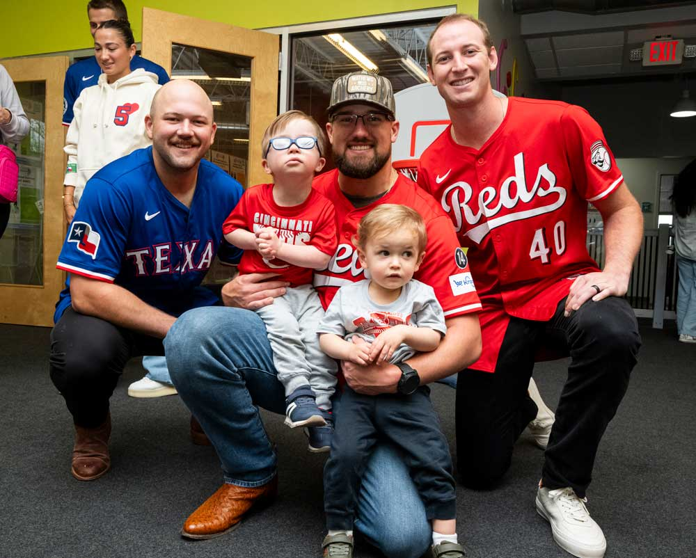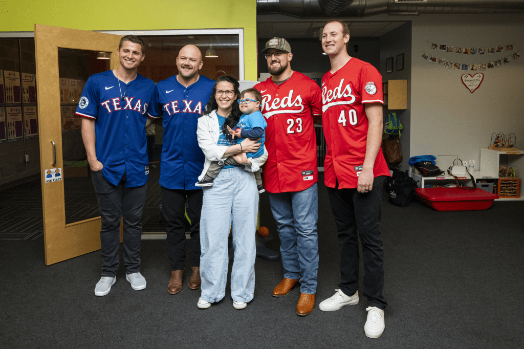 The tour kicked off on March 31 at GiGi’s Playhouse Cincinnati, where Jake Burger, Texas Rangers teammate Corey Seager, and Cincinnati Reds players Graham Ashcraft and Nick Lodolo toured the Playhouse, participated in programs, and met with families served by GiGi’s Playhouse.