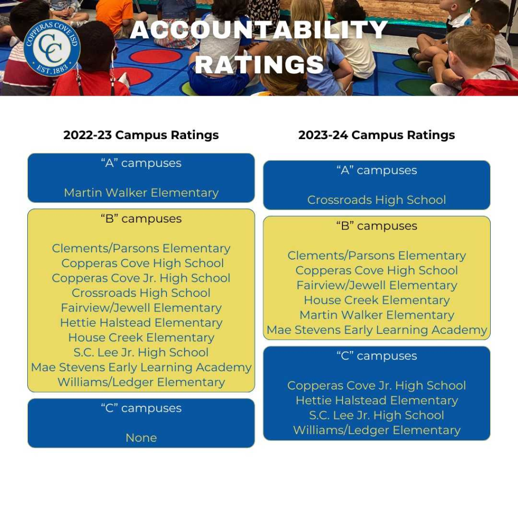 Joining House Creek with a B rating were nearly all other CCISD campuses, including Clements/Parsons Elementary, Fairview/Jewell Elementary, Hettie Halstead Elementary, Mae Stevens Early Learning Academy, Williams/Ledger Elementary, Copperas Cove High School, Copperas Cove Junior High, Crossroads High School, and S.C. Lee Junior High.