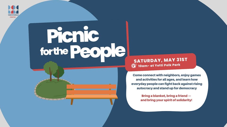Local grassroots organization based in Central Texas is hosting Picnic for the People on Saturday, May 31st from 10am to 1pm at Yettie Polk Park, located at 101 S. Davis Street in Belton. This historical park is situated along the Nolan Creek and features two playgrounds, picnic tables, ample bench seating, basketball courts, and plenty of parking space. The Hike and Bike Trail runs through the park, so ride on over!