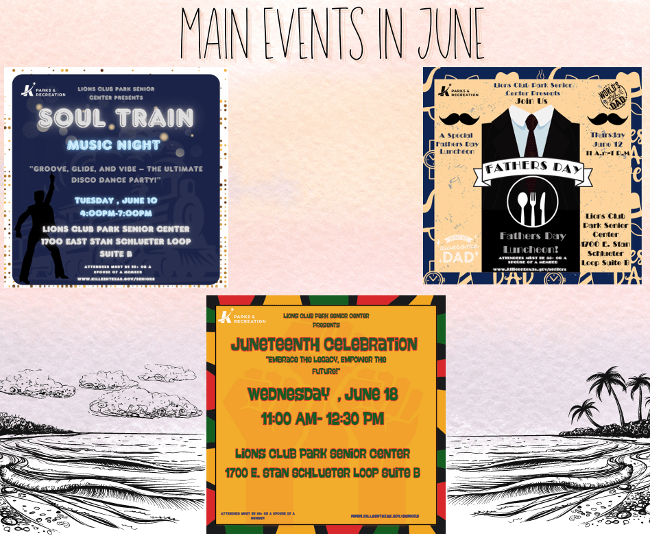 The Lions Club Park Senior Center is located at 1700-B East Stan Schlueter Loop in Killeen and they are open Monday through Friday from 8am to 4pm and their phone number is (254) 501-6399. Their June “Senior Scoop” newsletter is available on the city website, which is KilleenTexas.gov/seniors.