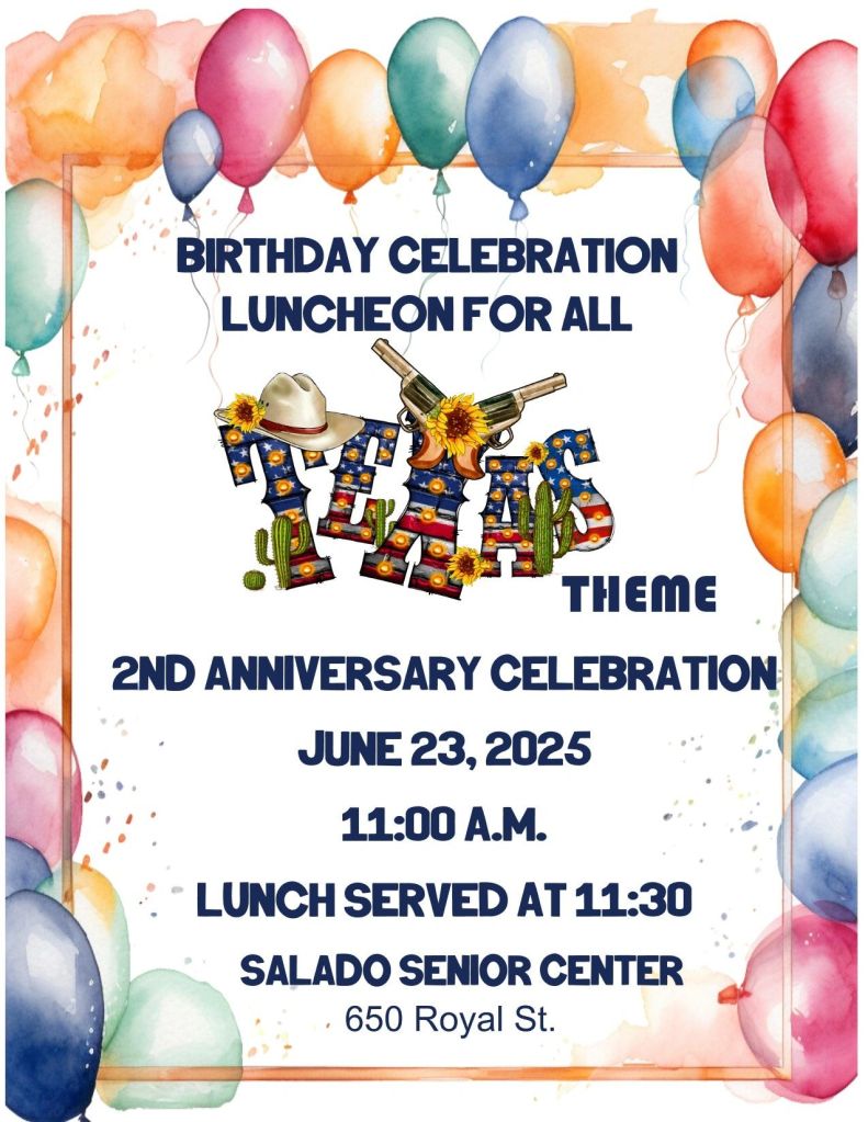 In the Salado, the senior center’s upcoming pop-up events include the 2nd Anniversary and Monthly Birthday Celebration. This is scheduled for Monday, June 23rd at 11am.