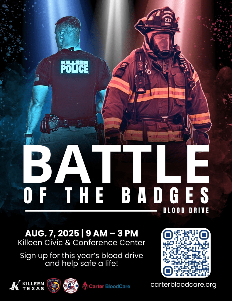 On Thursday, August 7, the City of Killeen will once again team up with Carter BloodCare to host the annual Battle of the Badges Blood Drive, a spirited competition between the Killeen Police Department and the Killeen Fire Department. The event runs from 9am to 3pm at the Killeen Civic & Conference Center, located at 3601 South W.S. Young Drive.