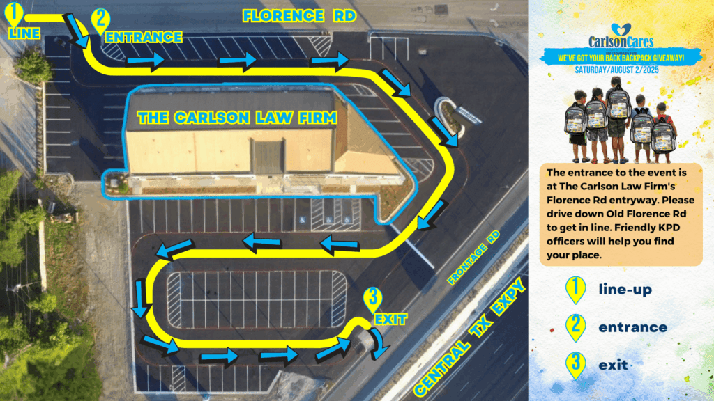 Families in Central Texas will get a helping hand this back-to-school season when The Carlson Law Firm hosts its annual backpack giveaway on Saturday, August 2nd, beginning at 10am at its Killeen office, 100 E Central TX Expressway. This year’s event embraces a drive-thru format, making it easy for families to receive KISD-compliant backpacks filled with essential school supplies—without leaving the comfort of their vehicles.