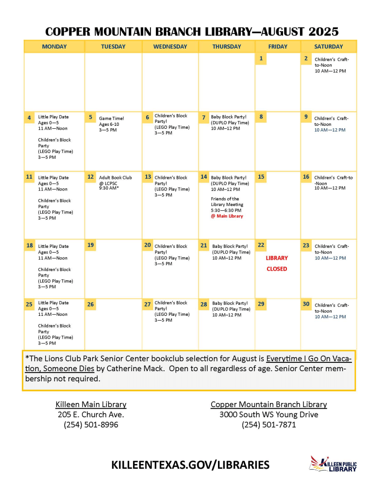 The Killeen Main Library, located at 205 E. Church Ave., and the Copper Mountain Branch Library, at 3000 South WS Young Dr., continue to serve as vibrant hubs for learning and community engagement. With programs tailored to every age and interest, August promises to be a month of meaningful moments and shared stories.