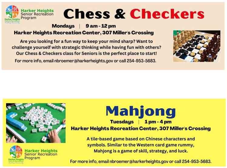 This month at the Harker Heights Recreation Center, seniors are invited to engage in two beloved games that offer more than just fun—they’re exercises in strategy, memory, and connection. Whether you’re a seasoned player or curious newcomer, the center’s Chess & Checkers and Mahjong classes provide a welcoming space to learn, play, and socialize.
