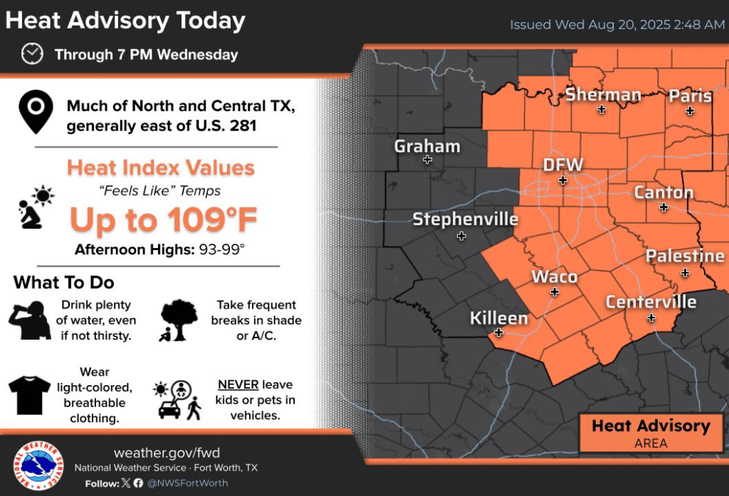 Wednesday greets Central Texas with a warm embrace—clear to partly cloudy skies and morning temps lounging in the 70s, stirred by a soft, variable breeze. But don’t let the calm fool you: a heat advisory is in effect as the day intensifies, with highs soaring into the mid to upper 90s and a heat index flirting between 105 and 110 degrees.