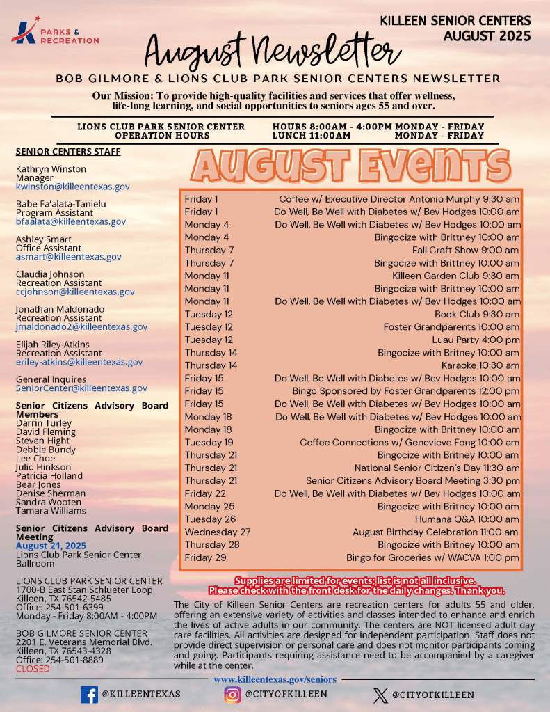 The final week of August is shaping up to be full of fun, fellowship, and feel-good moments at the Lions Club Park Senior Center in Killeen. Designed for adults age 55 and older, the center continues to be a vibrant hub for wellness, learning, and laughter—and this week’s lineup is no exception.