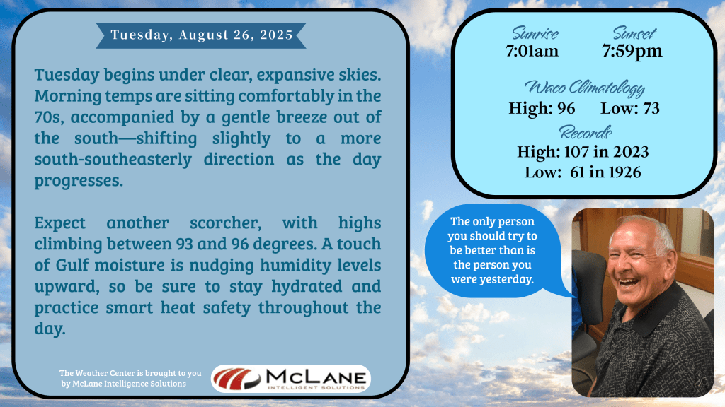 As Central Texas balances between lingering heat and approaching rain, it’s a good time to stay alert and weather-wise. This week’s forecast proves that late August still has a few surprises—blending summer’s intensity with early hints of seasonal change. Keep it tuned to KNCT for the latest updates from the National Weather Service and meteorologist Bill Hecke.