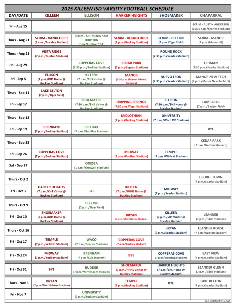 We’ve got the full season lineup for all five schools, and i14 Sports will be broadcasting several key games thanks to the great folks at KNCT and Central Texas College. Stay tuned for kickoff times and featured matchups!