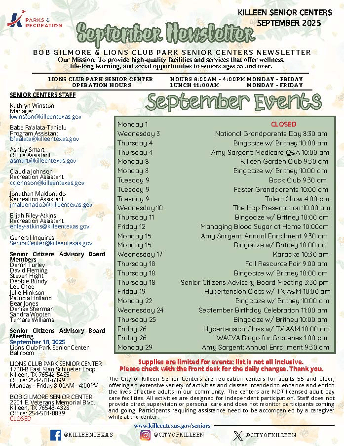 Space is limited, so early registration is encouraged! To sign up or learn more, visit killeentexas.gov/seniors, call (254) 501-6399, or email seniorcenter@killeentexas.gov.