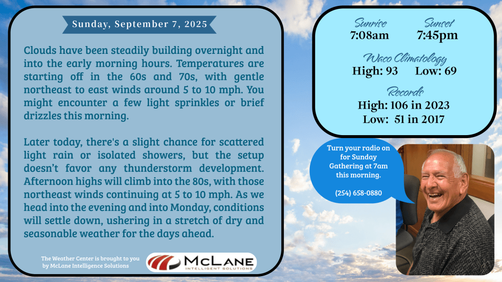 Central Texas is enjoying a rare September cooldown, with below-average temperatures expected to linger through the weekend. Highs will hover in the low 80s, offering a refreshing break from the usual late-summer heat. But don’t let the mild air fool you—there’s still some weather to watch.