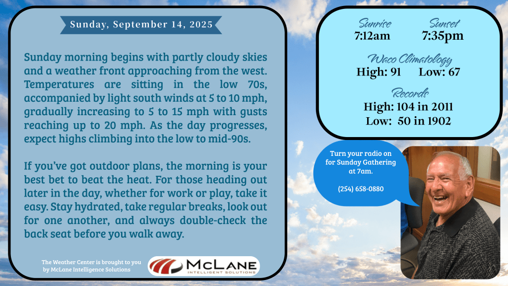 As the calendar inches deeper into September, summer refuses to loosen its grip across Central Texas and much of the nation. Today, skies will gradually cloud over, but the heat remains relentless. Highs are expected to soar into the lower to middle 90s, well above seasonal norms.