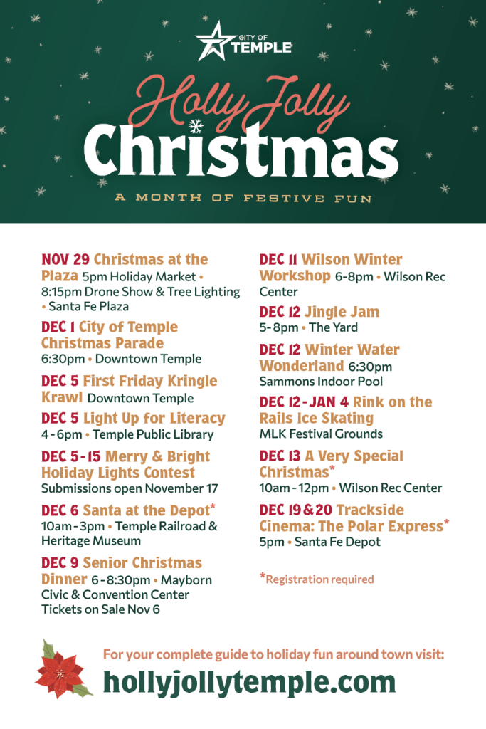 The City of Temple is ready to shine this holiday season with the return of Holly Jolly, a month-long celebration filled with sparkling lights, joyful gatherings, and family-friendly fun throughout December.