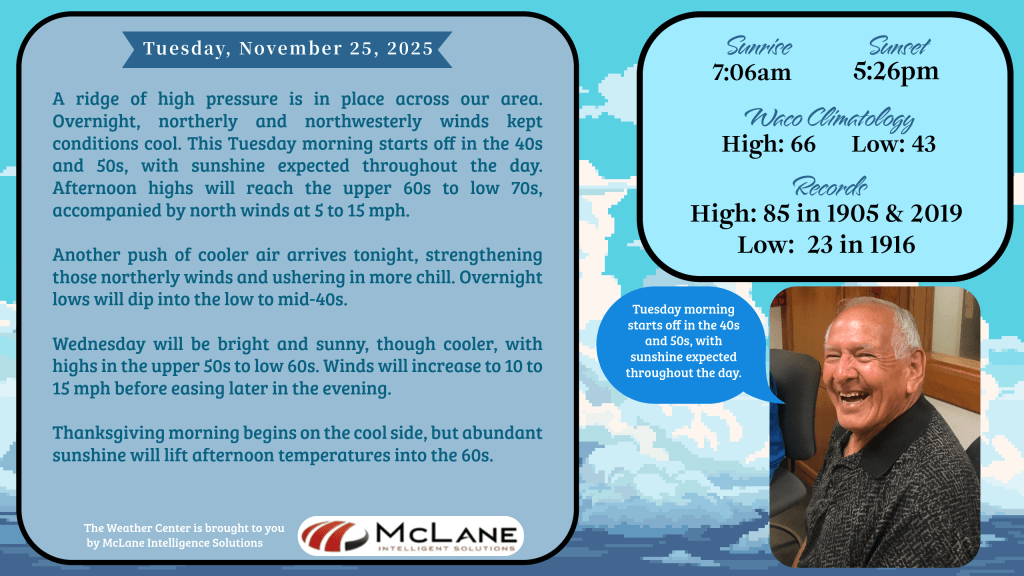 In the Austin and San Antonio area, today’s forecast calls for warm sunshine, with highs ranging from the low 70s in the north to the mid-80s in the south. Clear skies and light winds tonight will allow temperatures to fall into the mid-40s to lower 60s. Thanksgiving morning will be chilly, followed by mild and damp weather over the weekend as clouds increase.
