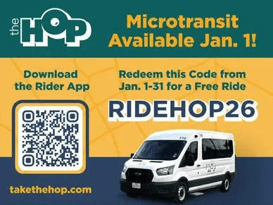 To mark the changes, The HOP is offering a January promotion. Riders can use promo code RIDEHOP26 to receive $4 in ride credit, equal to one microtransit round trip. The code is valid January 1–31, 2026, and may be redeemed once per rider account.