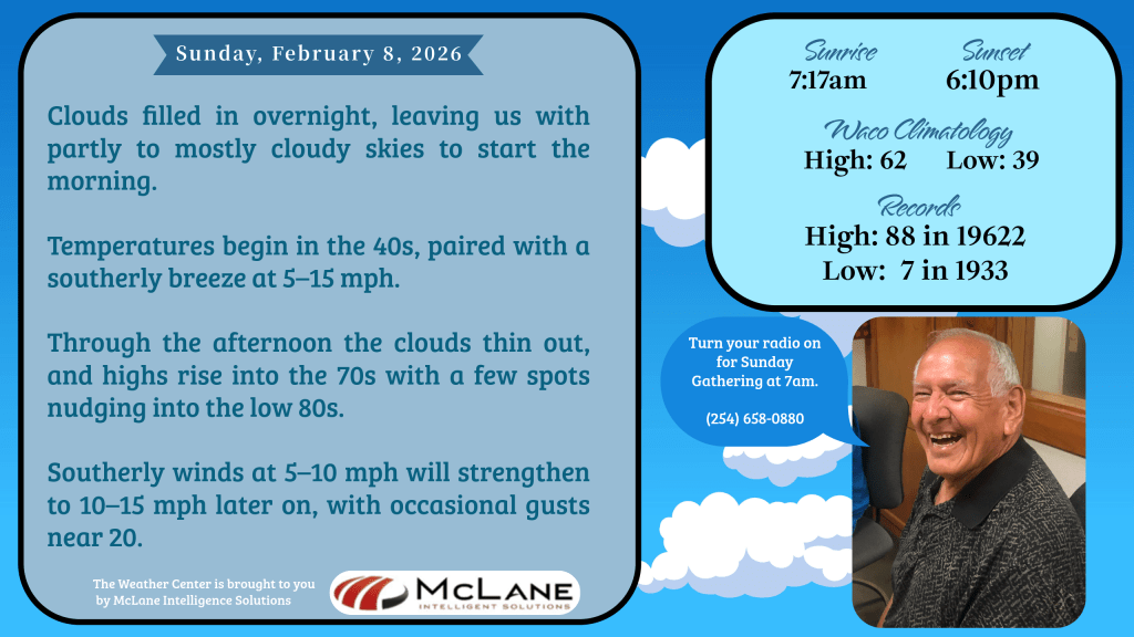 Across the Austin and San Antonio corridor, partly cloudy skies accompany highs in the mid‑ to upper‑70s and lower‑80s today. Winds start out light and variable before shifting to the south this afternoon.