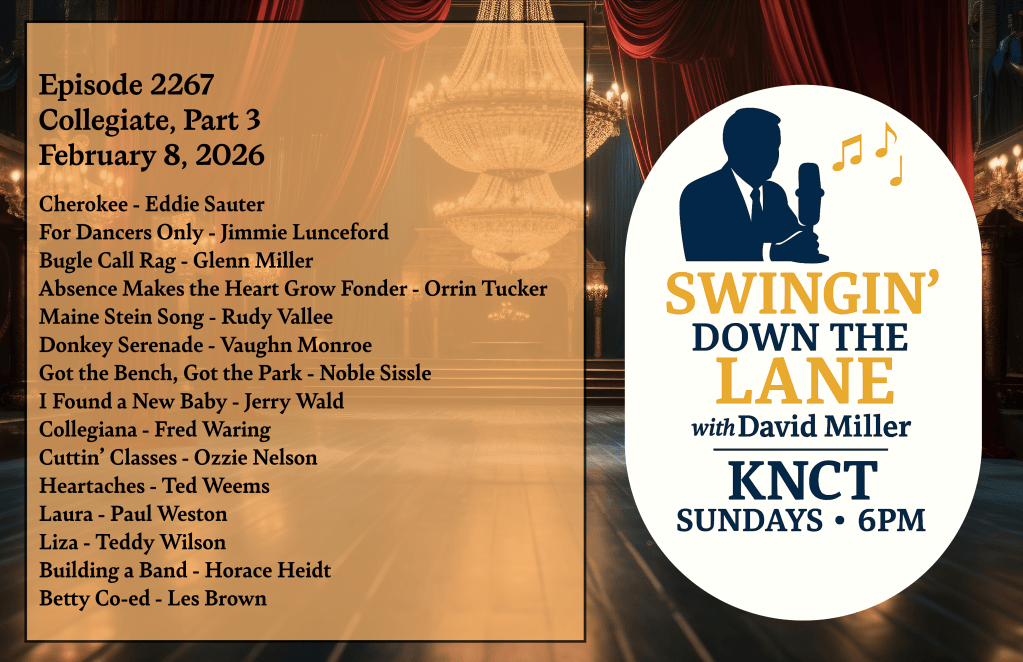 This evening’s episode of Swingin’ Down the Lane with David Miller brings listeners another deep dive into the college days of America’s great bandleaders. Beginning at 6pm on KNCT, episode 2267 continues David Miller’s multi‑part look at the universities and campuses that helped shape the musicians who later defined the big‑band era.