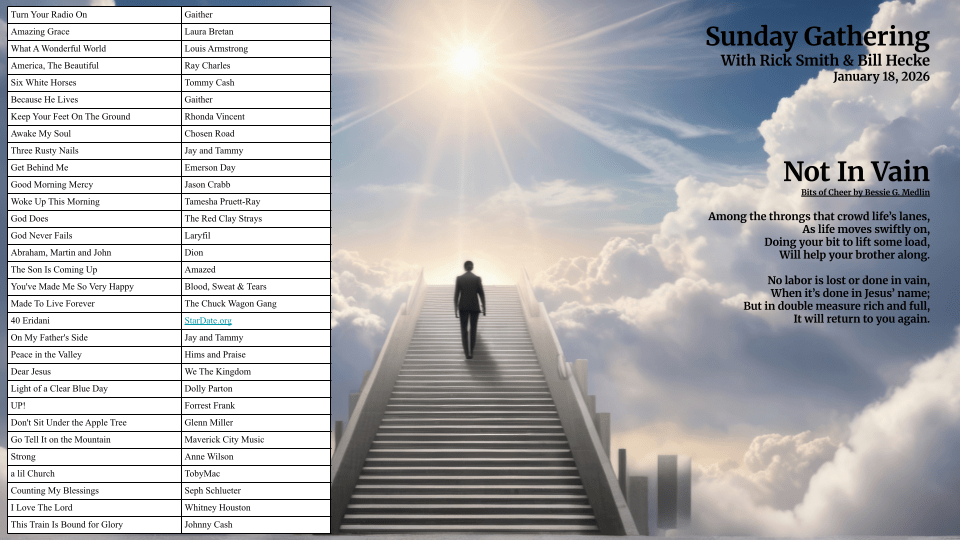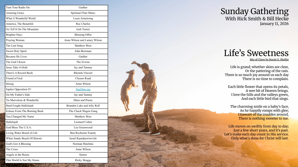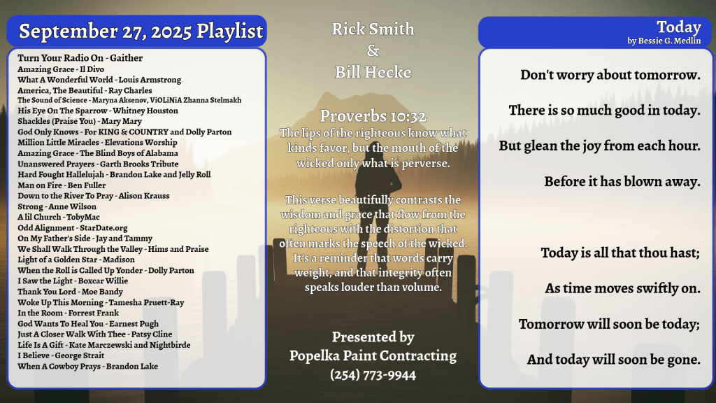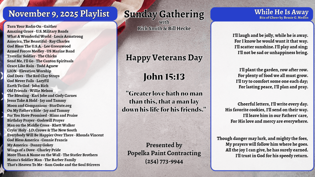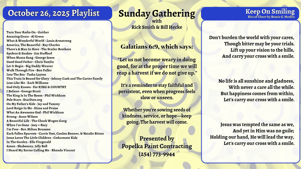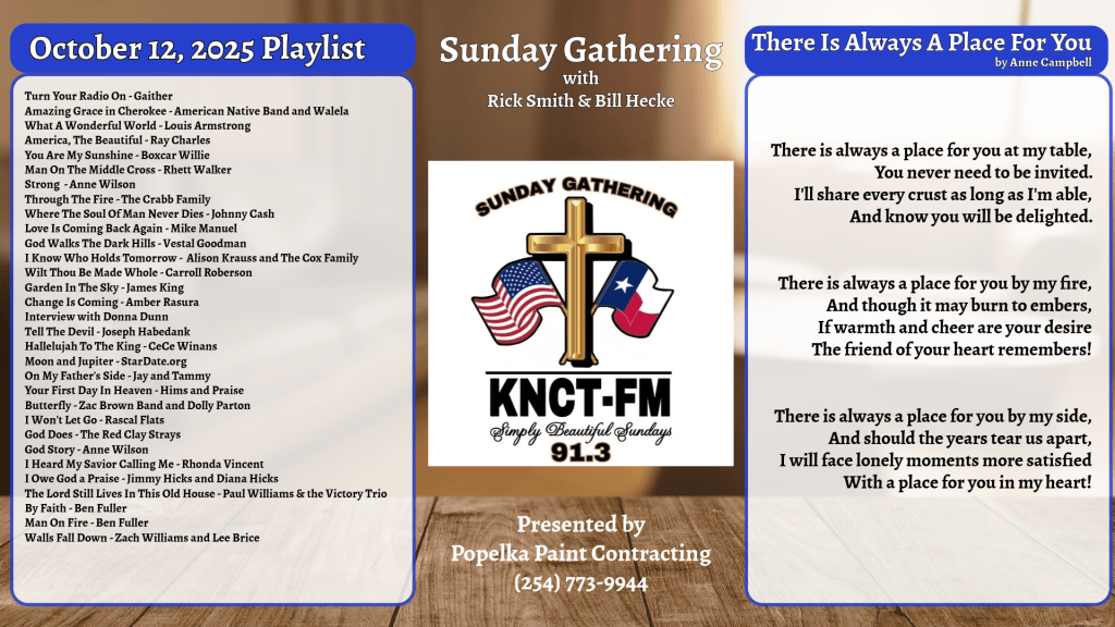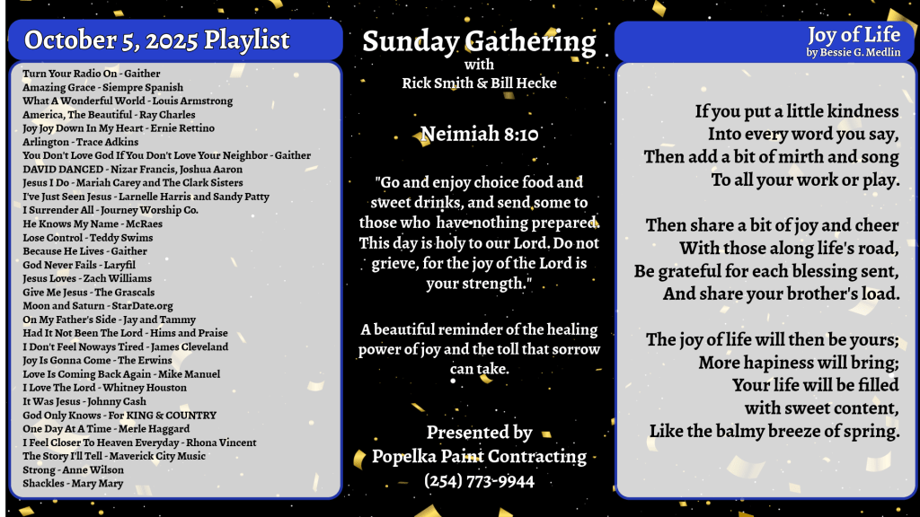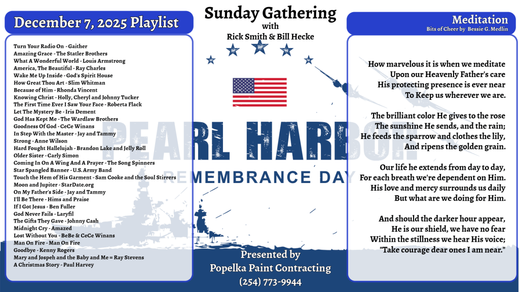 If you enjoy Southern Gospel music, you’ll enjoy Sunday Gathering. Hosted by everyone’s favorite weather man, Bill Hecke, and Brother Rick Smith. Musical requests are always welcome at (254) 658-0880, message us on our Facebook page, or request a song on our streaming website.